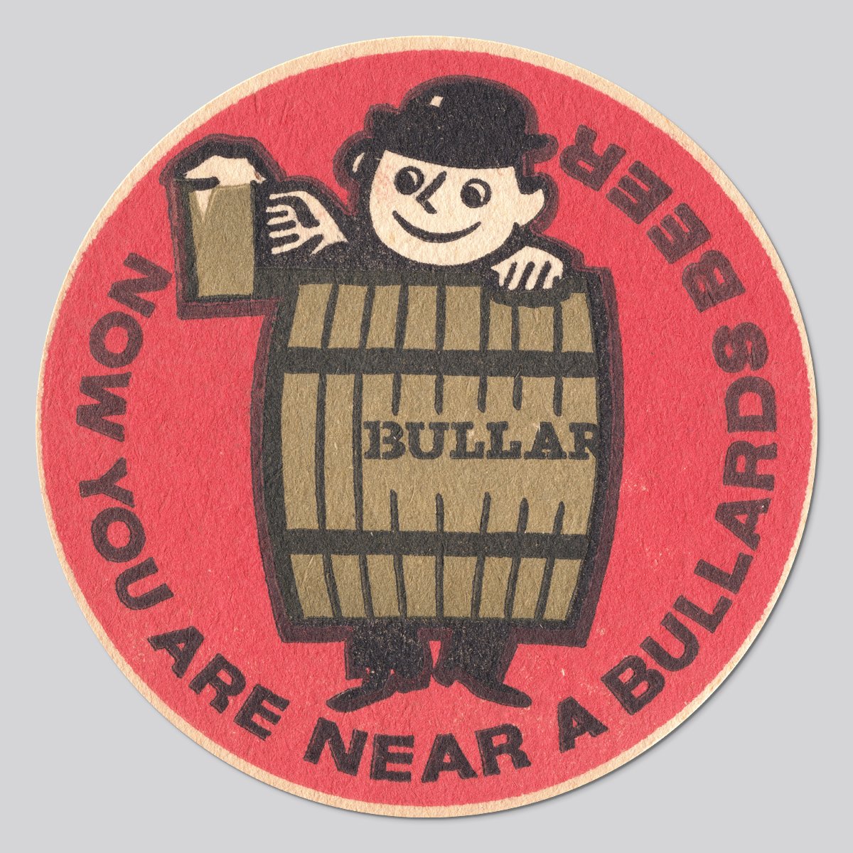 Details: This 1961 beer mat advertises Bullards beer. The artist is uncredited.
