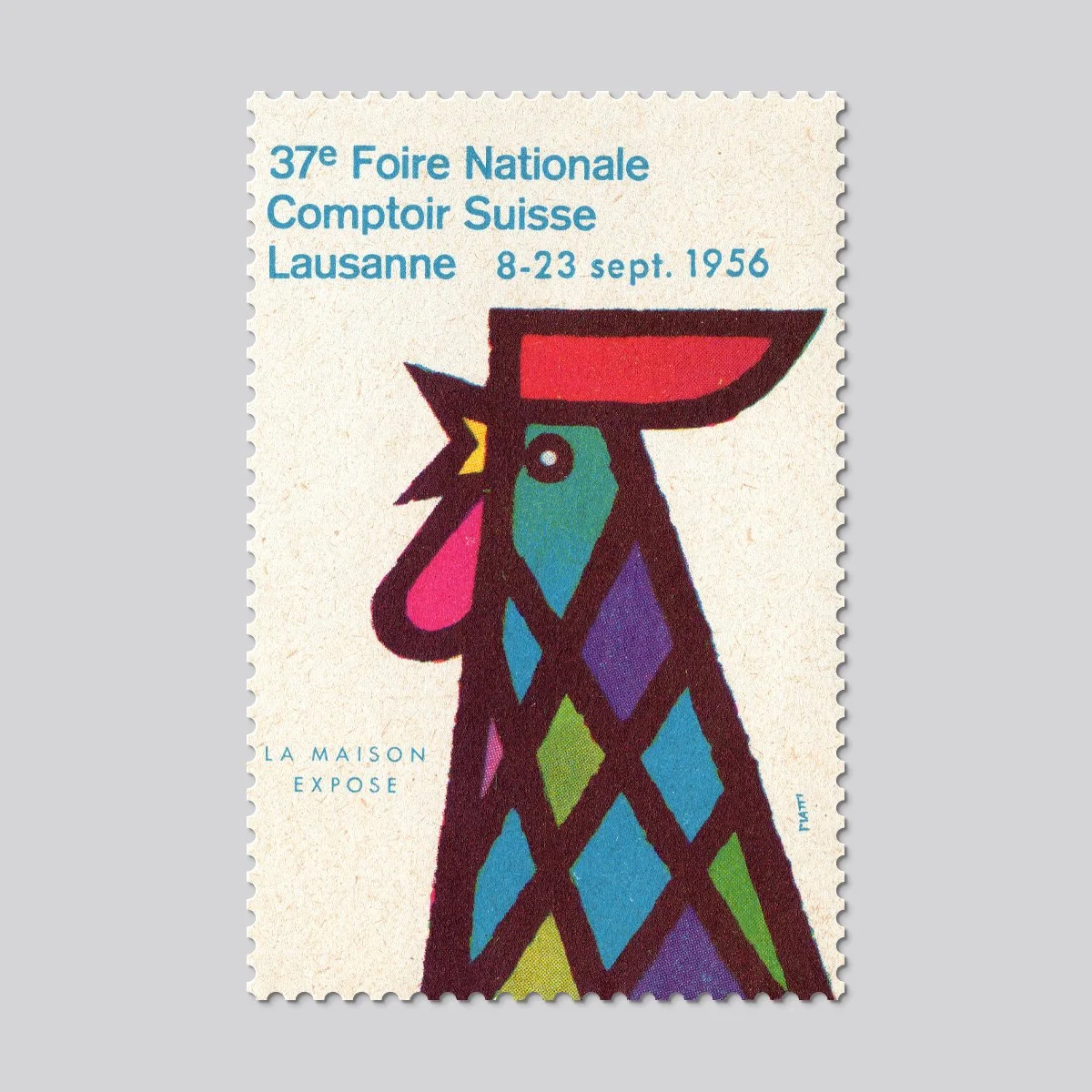 Details: This stamp advertises the 1956 Foire Nationale Comptoir Suisse. The artwork is signed 'Piatti' - Swiss designer Celestino Piatti (1922-2007). Piatti created posters for this event on several occasions.