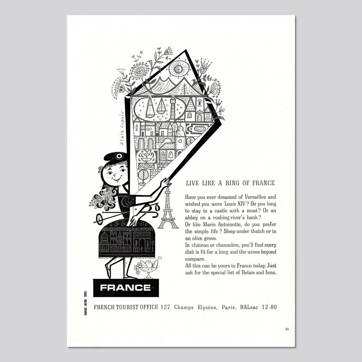Details: French artist Alain Cornic (b. 1920) created this magazine illustration to advertise the French Tourist Office in 1961.